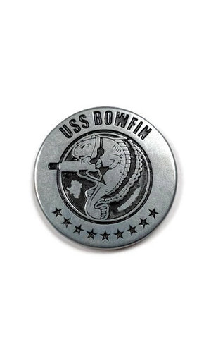 This token features the image of the USS Bowfin submarine, its commission and decommision dates (1943-1971), and its current home at Pearl Harbor, Hawaii. The reverse side shows the USS Bowfin's logo. The token is approximately 1 inch in diameter.