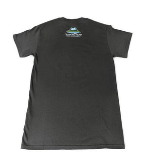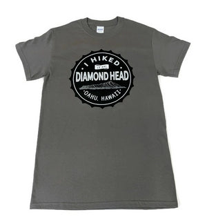 Dark gray shirt with black and white design that says "I Hiked Diamond Head" and "Oahu, Hawaii". The back of the shirt features the Diamond Head logo.