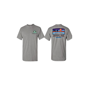 Diamond Head Sunscape Tee, Gray - This T-shirt is gray with the Diamond Head Leahi logo on the front left chest area, and the back of the shirt has a vibrant picture of Diamond Head's silhouette in gray and the sunset behind it with a bright orange color, and three dark palm trees near it too. The bottom of the tee has a line that says "Hawaii's National Natural Landmark" with an orange line above it, and a blue text box below that says "Oahu, Hawaii," which is where Diamond Head is located.