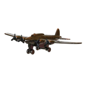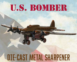 Pencil Sharpener - B-17 Bomber Plane - This die-cast, antique finish miniature B-17 bomber is a unique pencil sharpener. Tiny wheels allow it to roll across a table. The tiny propellers are moveable as well. Makes a great conversation piece and gift. Measures 5.5 inches (wingspan), 3.5 inches (nose to tail), and stands 1 inch high.