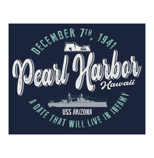 Pearl Harbor Script Circle Tee. Featuring Pearl Harbor, Hawaii. USS Arizona Battleship and USS Arizona Memorial. December 7th, 1941, A Date That Will Live In Infamy. American Flag with the USS Arizona Battleship, Pearl Harbor National Memorial on the front.